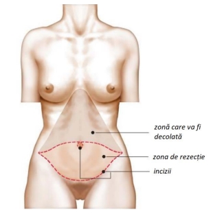 Pielea sănătoasă, situată în general deasupra ombilicului, va fi trasă în jos, astfel încât să se reconstituie un perete abdominal cu piele de bună calitate.