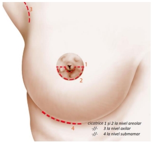 areolar, cu incizie în segmentul inferior al circumferinței areolei, sau cu incizie orizontală ocolind mamelonul prin partea de jos (1 și 2);